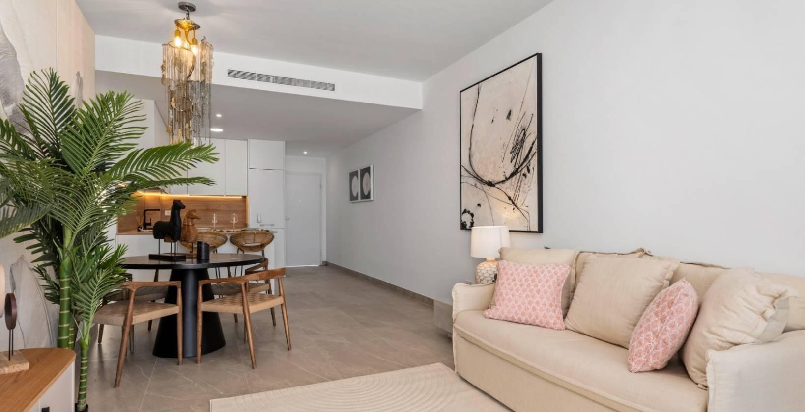 The complex also offers a shared swimming pool and optional private parking, providing comfort for everyday living. Additional features include built-in wardrobes, pre-installed air conditioning, and secure doors. Local amenities, such as bars, supermarkets, and bakeries, are just around the corner. The beach is located only 10 km away, and the nearest airport is 40 km away. Additionally, golf courses and recreational areas are within close proximity, ideal for active leisure.
