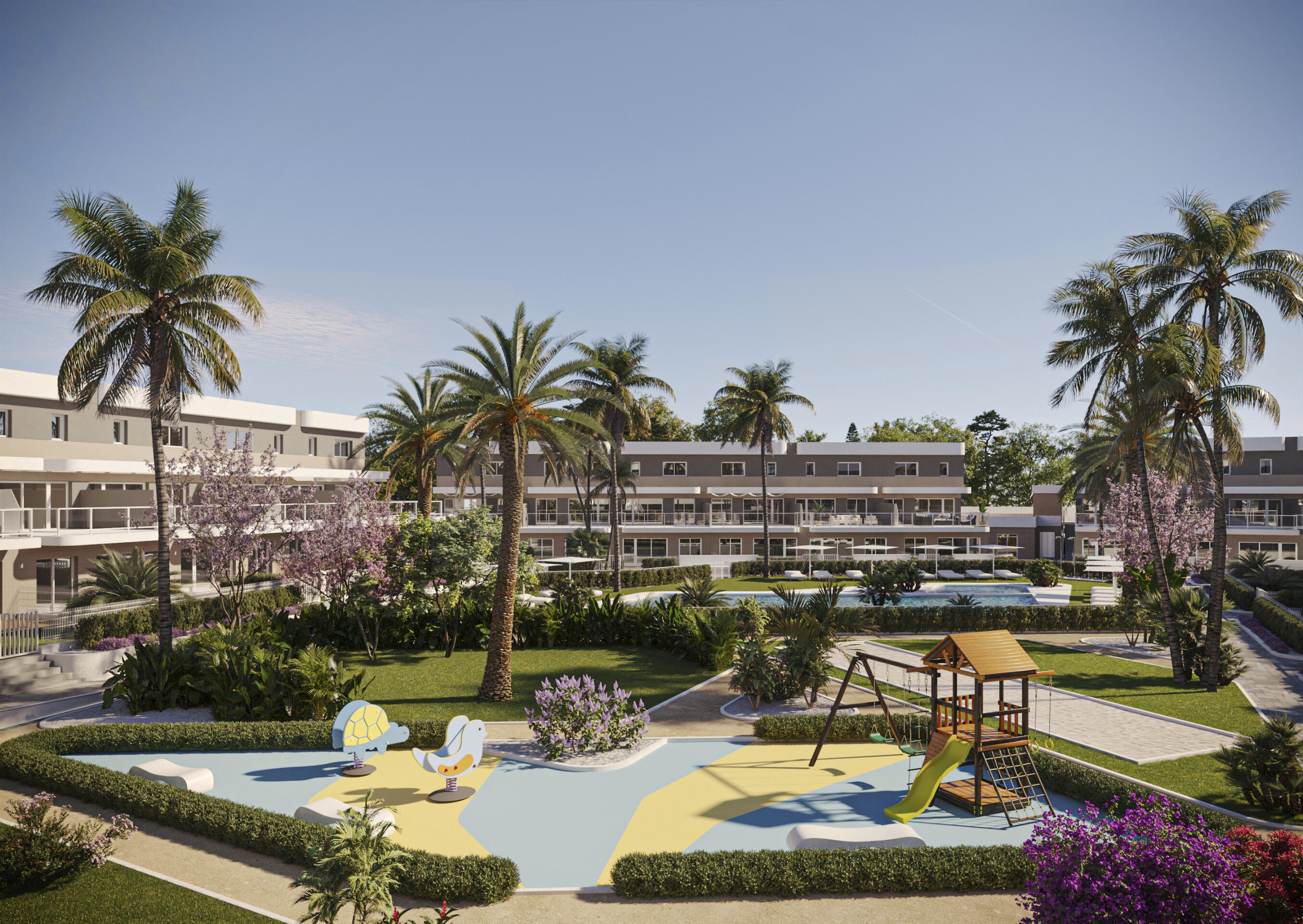 Each apartment offers 2 or 3 bedrooms and 2 elegant bathrooms, along with spacious terraces overlooking lush greenery. The interiors feature a modern finish and come fully equipped – kitchens are furnished and include a ceramic hob, extractor hood, and oven. For year-round comfort, the homes are fitted with hot/cold air conditioning and built-in wardrobes in the bedrooms. Every property includes a parking space, and some also feature private gardens or storage rooms.