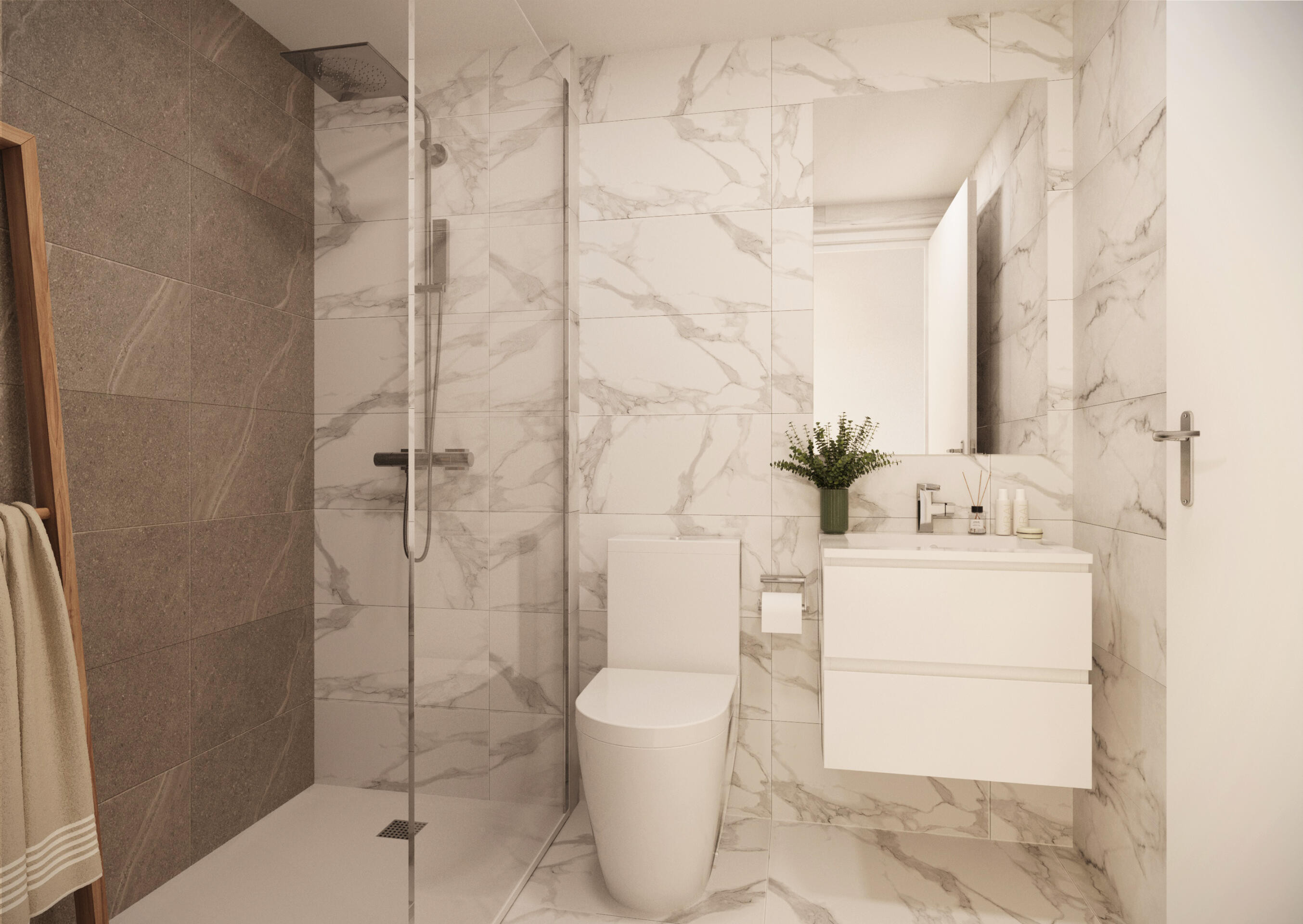 Apartments at Valonia Resort have been designed with attention to detail, functionality and privacy. Ground-floor properties feature private gardens, while top-floor penthouses offer spacious solariums with open views over the communal areas. All apartments overlook the shared spaces, allowing residents to enjoy the greenery and resort-style atmosphere. Each property includes air conditioning, a private garage space, a storage room and access to modern solutions such as electric vehicle charging points.
